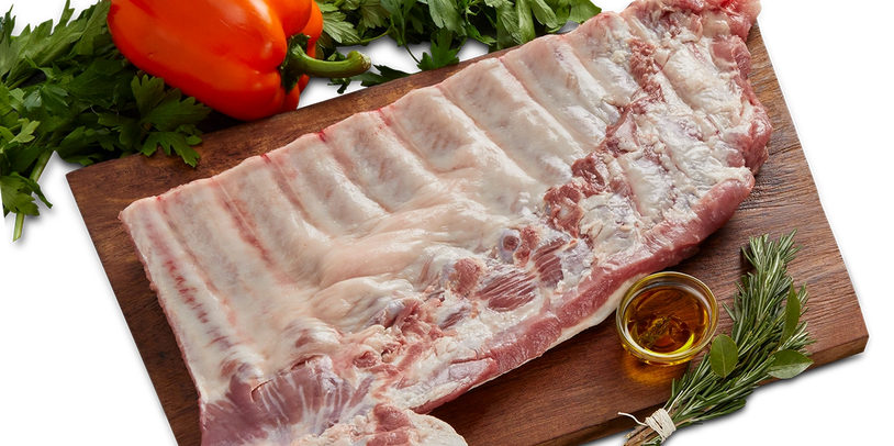 Costilla rasurada obtenida de la parte ventral (panceta), sin unto, con 0 mm de cobertura de carne y con el hueso del esternón.